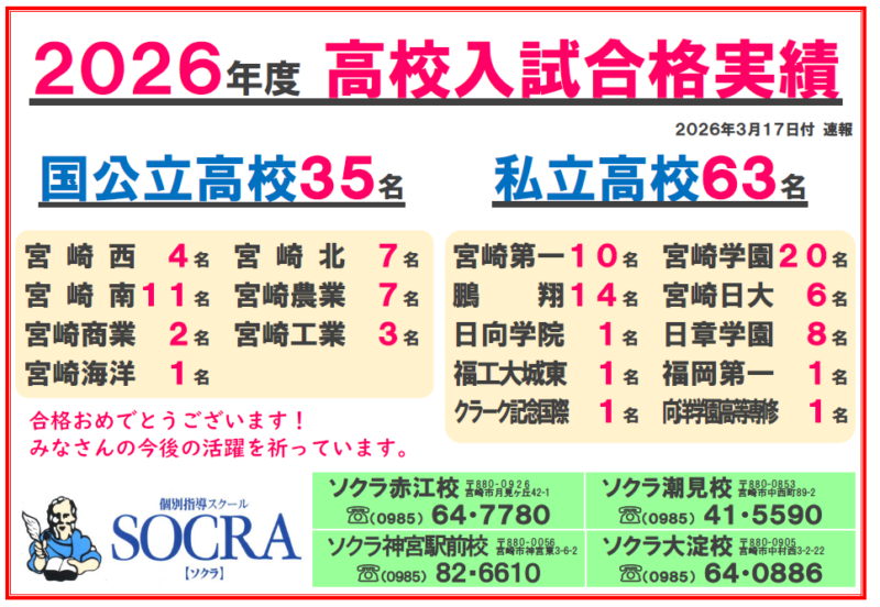 <塾長ブログvol.379>2026年度宮崎県立高校全員合格🌸最新の合格実績をご紹介☆彡